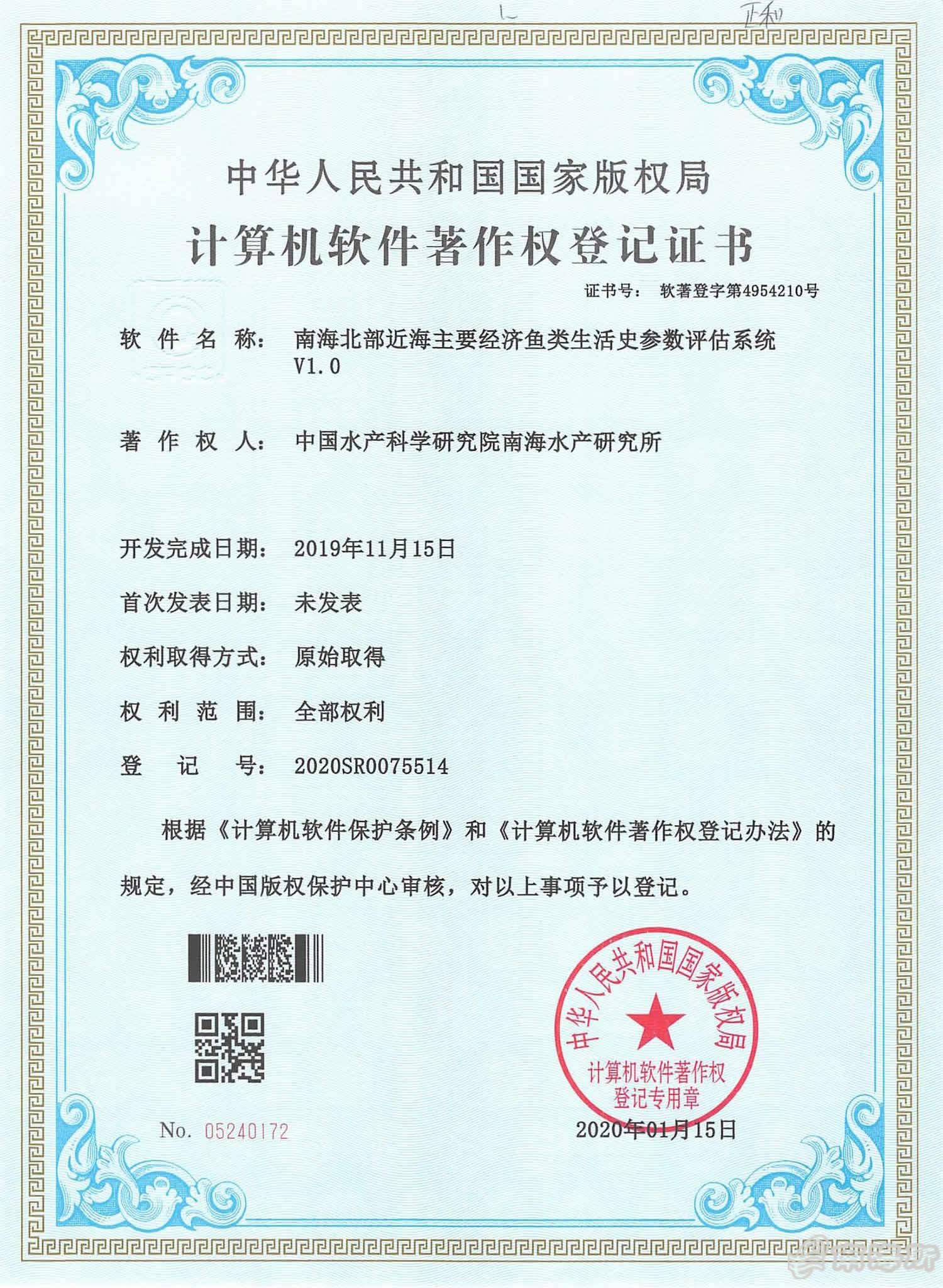 鏃ュ墠錛岀敱涓浗姘翠駭縐戝鐮旂┒闄㈠崡嫻鋒按浜х爺絀舵墍寮犻瓉絳夌爺鍙戠殑鈥滃崡嫻峰寳閮ㄨ繎嫻蜂富瑕佺粡嫻庨奔綾葷敓媧誨彶鍙傛暟璇勪及緋葷粺V1.0鈥濊幏寰楀浗瀹剁増鏉冨眬璁$畻鏈鴻蔣浠惰憲浣滄潈鐧昏璇佷功錛岃瘉涔﹀彿涓鴻蔣钁楃櫥瀛楃4954210鍙鳳紝鐧昏鍙蜂負2020SR0075514銆?/p>