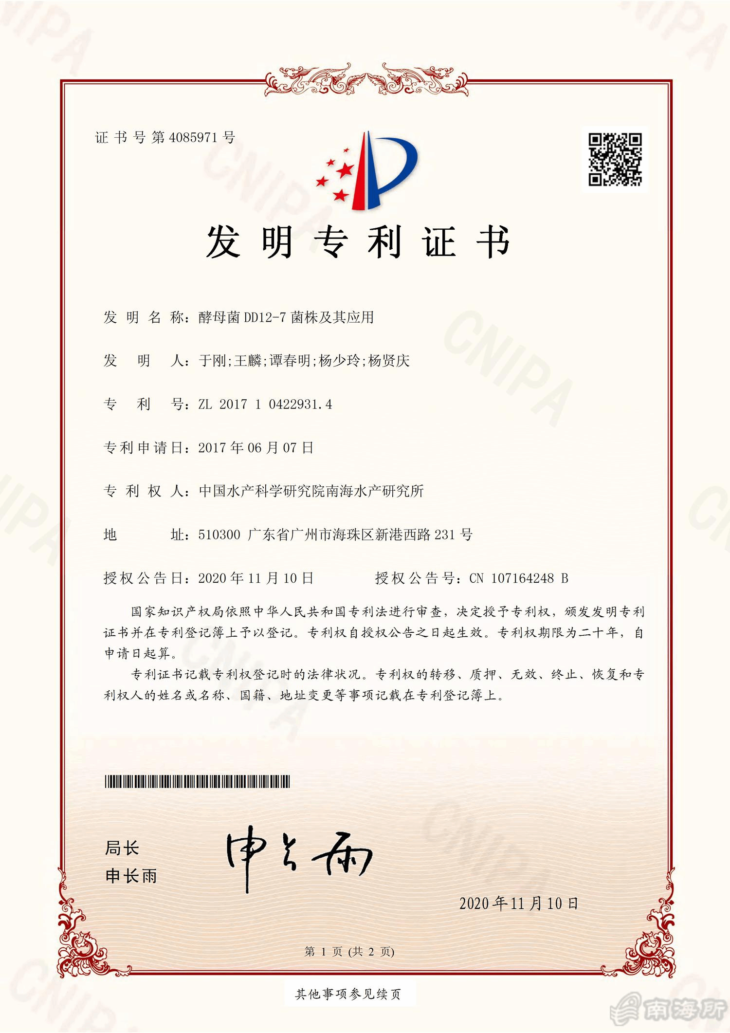 鏃ュ墠錛岀敱涓浗姘翠駭縐戝鐮旂┒闄㈠崡嫻鋒按浜х爺絀舵墍浜庡垰銆佺帇楹熴佽礙鏄ユ槑絳夊彂鏄庣殑鈥滈叺姣嶈弻DD12-7鑿屾牚鍙婂叾搴旂敤鈥濊幏寰楀浗瀹跺彂鏄庝笓鍒╂巿鏉冿紝涓撳埄鍙蜂負ZL201710422931.4銆?/p>