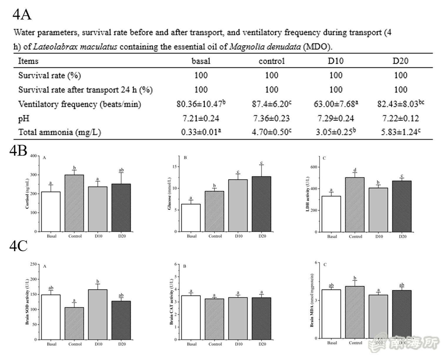 琛?A錛氭坊鍔犵櫧鐜夊叞綺炬補闀囬潤闄嶄綆浜嗕腑鍥借姳椴堣繍杈撹繃紼嬬殑鍛煎惛棰戠巼錛岃繍杈撳悗鐨勬皚姘祿搴︺傚浘4B錛氭坊鍔犵櫧鐜夊叞綺炬補榪愯緭鍚庣紦瑙d簡涓浗鑺遍矆琛娓呭搴旀縺鎸囨爣錛堢毊璐ㄩ唶錛岃緋栵紝涔抽吀鑴辨阿閰訛級鐨勪笂鍗囥傚浘4C錛氭坊鍔犵櫧鐜夊叞綺炬補榪愯緭鍚庝腑鍥借姳椴堢紦瑙d簡鑴戞姉姘у寲鎸囨爣錛圫OD錛孋AT錛孧DA錛夌殑涓嬭皟錛堟憳鑷浘紲ュ叺絳夌殑鐮旂┒璁烘枃錛歓eng, X, Dong, H, Yang, Y, Li, T, LI, C, Zhang, J, 2022 Effects of essential oil of Magnolia denudata on spotted seabass (Lateolabrax maculatus) during simulated live transportation. Aquaculture, 739258.錛夈?/span>