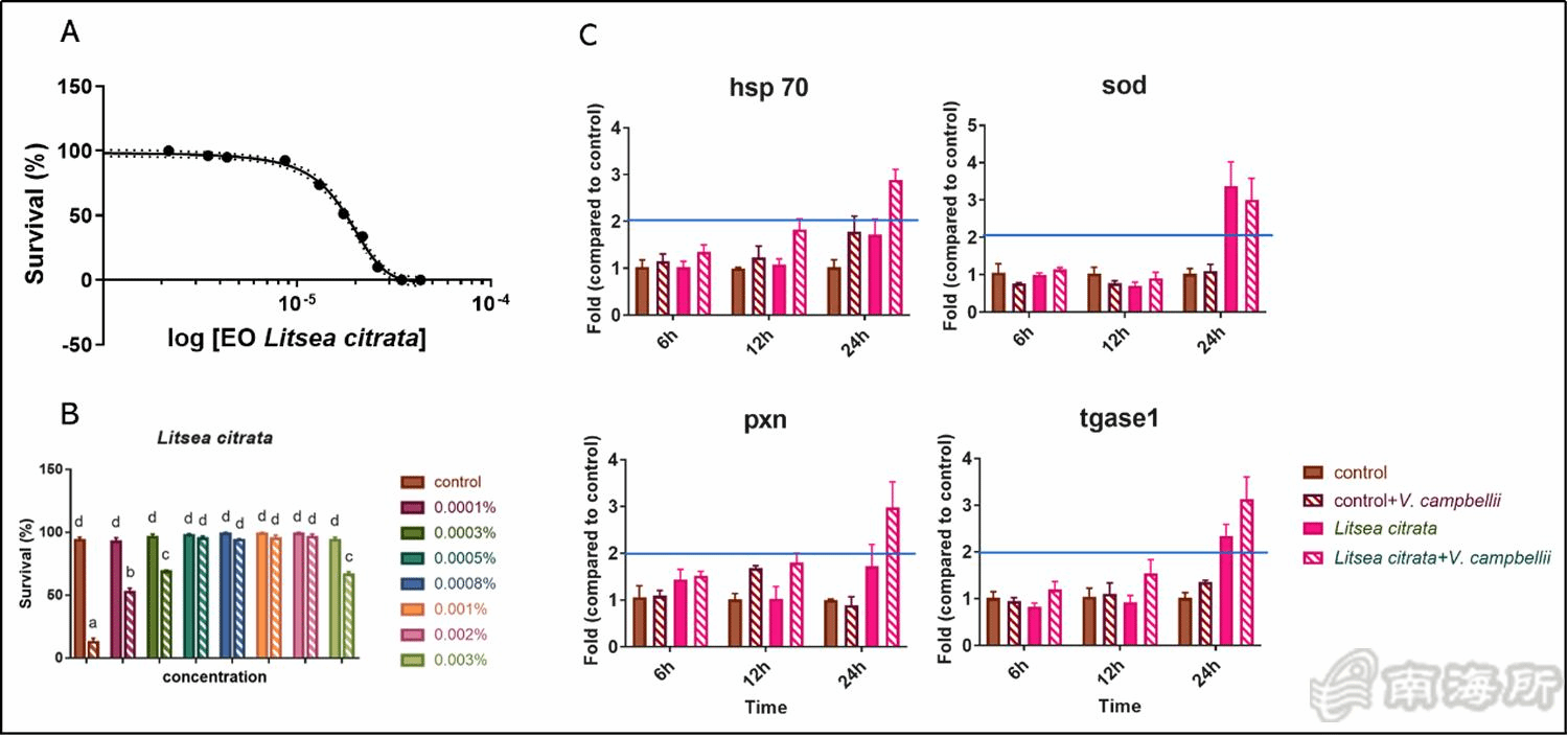 鍥?A錛氬北鑻嶇苯綺炬補瀵瑰崵铏殑鎬ユф瘨鐞嗗疄楠岋紝緇撴灉鏄劇ず灞辮媿綾界簿娌瑰鍗よ櫕鐨?8h鍗婅嚧姝繪祿搴︼紙LC50鈥?8h錛変負0.004%銆傚浘2B錛氫綋鍐呮敾姣掑疄楠岀粨鏋滄樉紺?-0.003%灞辮媿綾界簿娌瑰鍗よ櫕鐨勬病鏈夋瘨鍓綔鐢紝鍦ㄥ彂鍏夊潕姘忓姬鑿屾劅鏌撲笅錛?.0005-0.002%灞辮媿綾界簿娌規(guī)樉钁楁彁楂樺崵铏殑瀛樻椿鐜囷紙鍚屼竴嫻撳害緇勫埆錛屽乏鍒楁病鏈夋劅鏌撳姬鑿岋紝鍙沖垪榪涜寮ц弻鎰熸煋錛夈傚浘2C錛?.002%灞辮媿綾界簿娌規(guī)彁楂樹簡鍗よ櫕錛堝彂鍏夊潕姘忓姬鑿屾劅鏌撳悗錛塰sp 70銆乻od銆乸xn鍜宼gase 1鍩哄洜鐨勮〃杈炬按騫籌紙鎽樿嚜閮戞檽濠風瓑鐨勭爺絀惰鏂囷細Zheng X T, Han B, Kumar V, Feyaerts A F, Van Dijck P, Bossier P. Essential oils improve the survival of gnotobiotic brine shrimp (Artemia franciscana) challenged with Vibrio campbellii. Frontiers in Immunology, 2021,12:693932錛夈?/span>