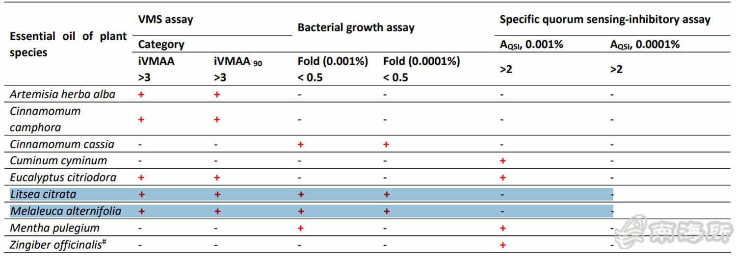 琛?錛氶噰鐢∣D鍊兼硶銆佹皵鐩告墿鏁f硶鍜岀敓鐗╁彂鍏夋嫻嬫硶錛岀瓫閫夊嚭浣撳鑳芥姂鍒跺彂鍏夊潕姘忓姬鑿岃兘鍔涚殑妞嶇墿綺炬補銆傜粨鏋滄樉紺哄北鑻嶇苯綺炬補錛?em>Litsea citrata錛夊拰鑼舵爲綺炬補錛?em>Melaleuca alternifolia錛夊叿鏈夋姂鍒跺彂鍏夊潕姘忓姬鑿岀敓闀跨殑鑳藉姏錛堟憳鑷儜鏅撳┓絳夌殑鐮旂┒璁烘枃錛歓heng X T, Feyaerts A F, Van Dijck P, Bossier P. Inhibitory activity of essential oils against Vibrio campbellii and Vibrio parahaemolyticus. Microorganisms, 2020,8(12):1946錛夈?/span>