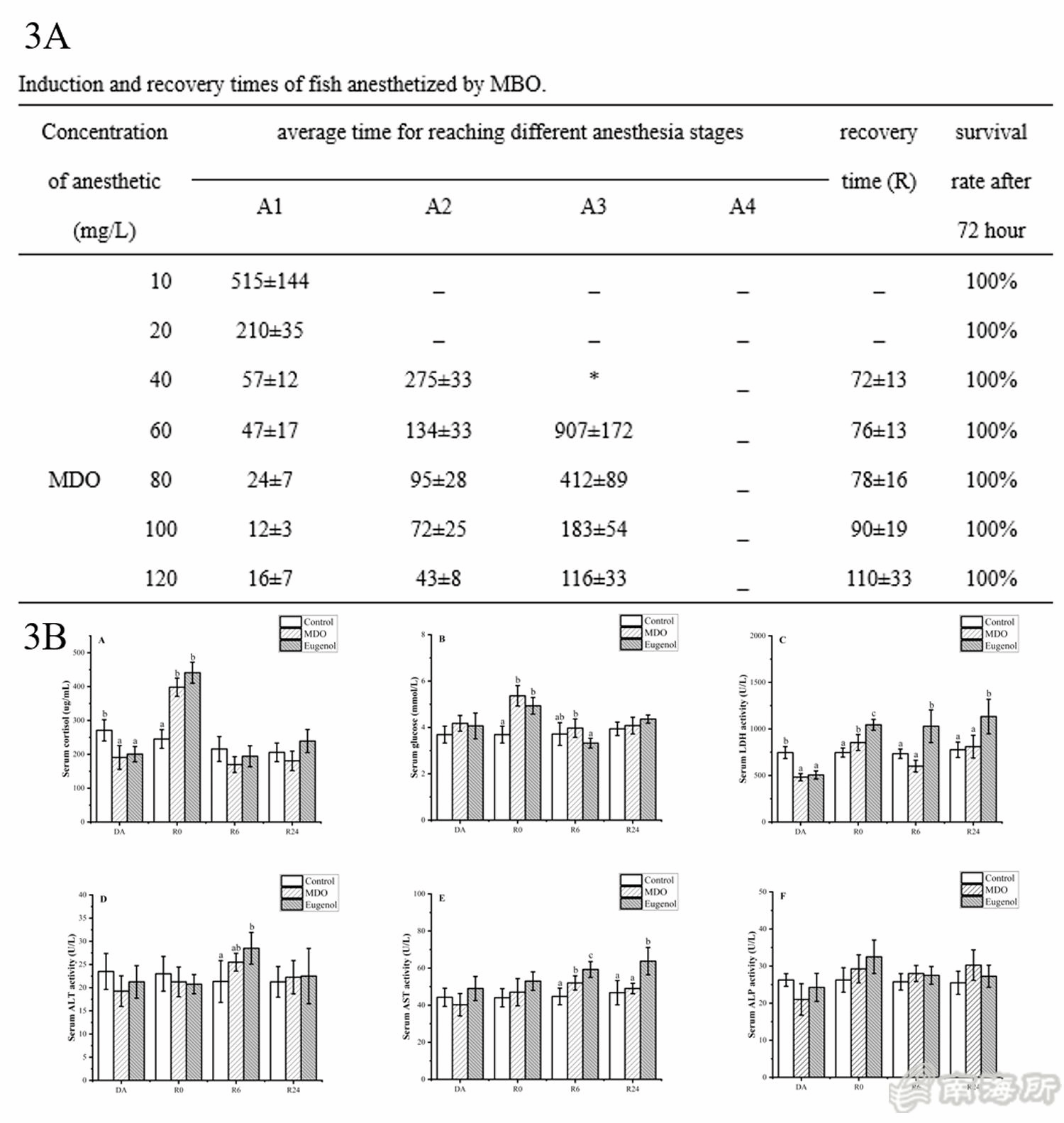琛?A錛氱櫧鐜夊叞綺炬補瀵逛腑鍥借姳椴堥夯閱夋晥鏋滆瘎浼幫紝鍩轟簬A3闃舵<180 s鐨勬椂闂存爣鍑嗭紝鐧界帀鍏扮簿娌圭殑鏈浣庨夯閱夋湁鏁堟祿搴︿負100 mg/L銆傚浘3B錛氬湪搴旀縺闃舵錛岀櫧鐜夊叞綺炬補鏈夋晥緙撹В浜嗙浉鍏沖簲嬋鎸囨爣鐨勪笂鍗囷紝涓斿湪鎭㈠闃舵錛岀櫧鐜夊叞綺炬補緇勭殑鑲濇崯浼ゆ寚鏍囪緝涓侀閰氫綆錛堟憳鑷浘紲ュ叺絳夌殑鐮旂┒璁烘枃錛歓eng, X, Dong, H, Wu, J, Wang, W, Duan, Y, Chen, J, Zhang, J, 2022. Essential oil of Magnolia denudata is an effective anesthetic for spotted seabass (Lateolabrax maculatus): a test for its effect on blood biochemistry, physiology and gill morphology. Fish physiology and biochemistry 48, 1349鈥?363, 2022.錛夈?/span>