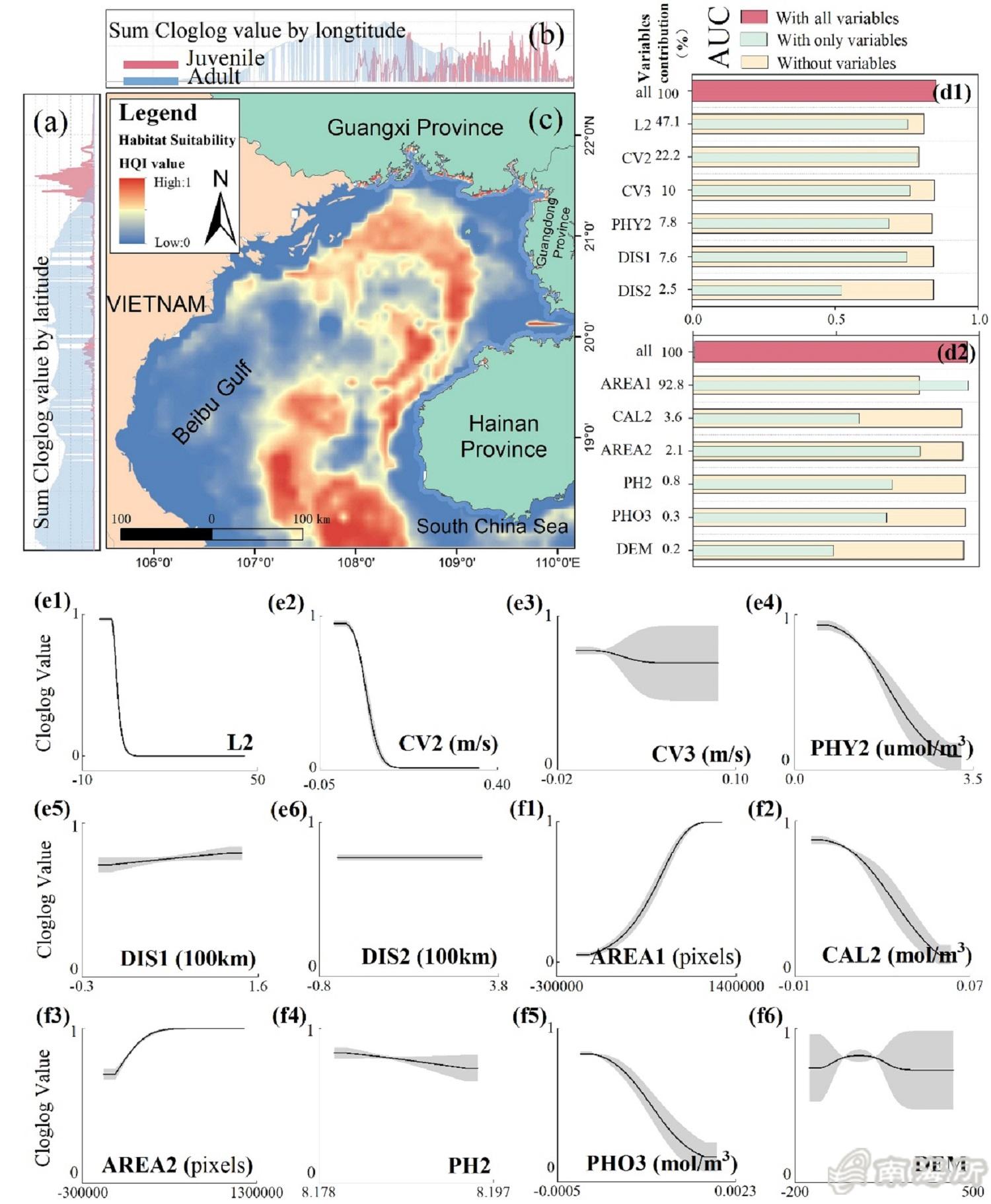 錛堢墿縐嶅垎甯冩ā鍨嬬粨鏋溿傜含搴︼紙a錛夊拰緇忓害錛?/span>b錛夌殑鏍栨伅鍦伴傚疁鎬у彉鍖栥備腑鍗庨矌鍦ㄨ繎嫻峰拰娼嘩鐨勬綔鍦ㄧ┖闂村垎甯冿紙c錛夈傛垚騫達紙d1錛夊拰騫煎勾錛?/span>d2錛変腑鍥介矌鐨勭墿縐嶅垎甯冩ā鍨嬩腑鍙橀噺鐨?/span>AUC璐$尞鍜?/span>jackknife嫻嬭瘯緇撴灉銆傛垚騫達紙e1鈥?/span>6錛夊拰騫煎勾錛?/span>f1鈥?/span>6錛夋ā鍨嬩腑璐$尞鏈澶х殑鍓嶅叚涓彉閲忓搷搴旀洸綰褲傦級