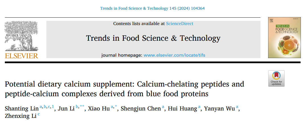 榪戞棩錛屼腑鍥芥按浜х瀛︾爺絀墮櫌鍗楁搗姘翠駭鐮旂┒鎵闄㈢駭姘翠駭鍝佺簿娣卞姞宸ヤ笌楂樺煎寲鍒╃敤鍒涙柊鍥㈤槦鍦ㄥ浗闄呴鍝乀op鏈熷垔Trends in Food Science & Technology錛堜腑縐戦櫌涓鍖猴紝IF: 15.3錛変笂錛屽彂琛ㄤ簡棰樹負鈥淧otential dietary calcium supplement: calcium-chelating peptides and peptide-calcium complexes derived from blue food proteins鈥濈殑緇艱堪鎬ц鏂囷紝涓轟互钃濊壊椋熺墿铔嬬櫧涓哄師鏂欏埗澶囪喅椋熼挋琛ュ厖鍓傛彁渚涗簡閲嶈鍙傝冦傚崡嫻鋒墍鑱斿悎鍩瑰吇鍗氬+鐮旂┒鐢熸灄鍠勫┓涓鴻璁烘枃絎竴浣滆咃紝鍗楁搗鎵鑳℃檽鐮旂┒鍛樺拰浠叉伜鍐滀笟宸ョ▼澶у杞誨伐椋熷搧瀛﹂櫌鏉庨獜鍓暀鎺堜負鍏卞悓閫氳浣滆呫?/p>