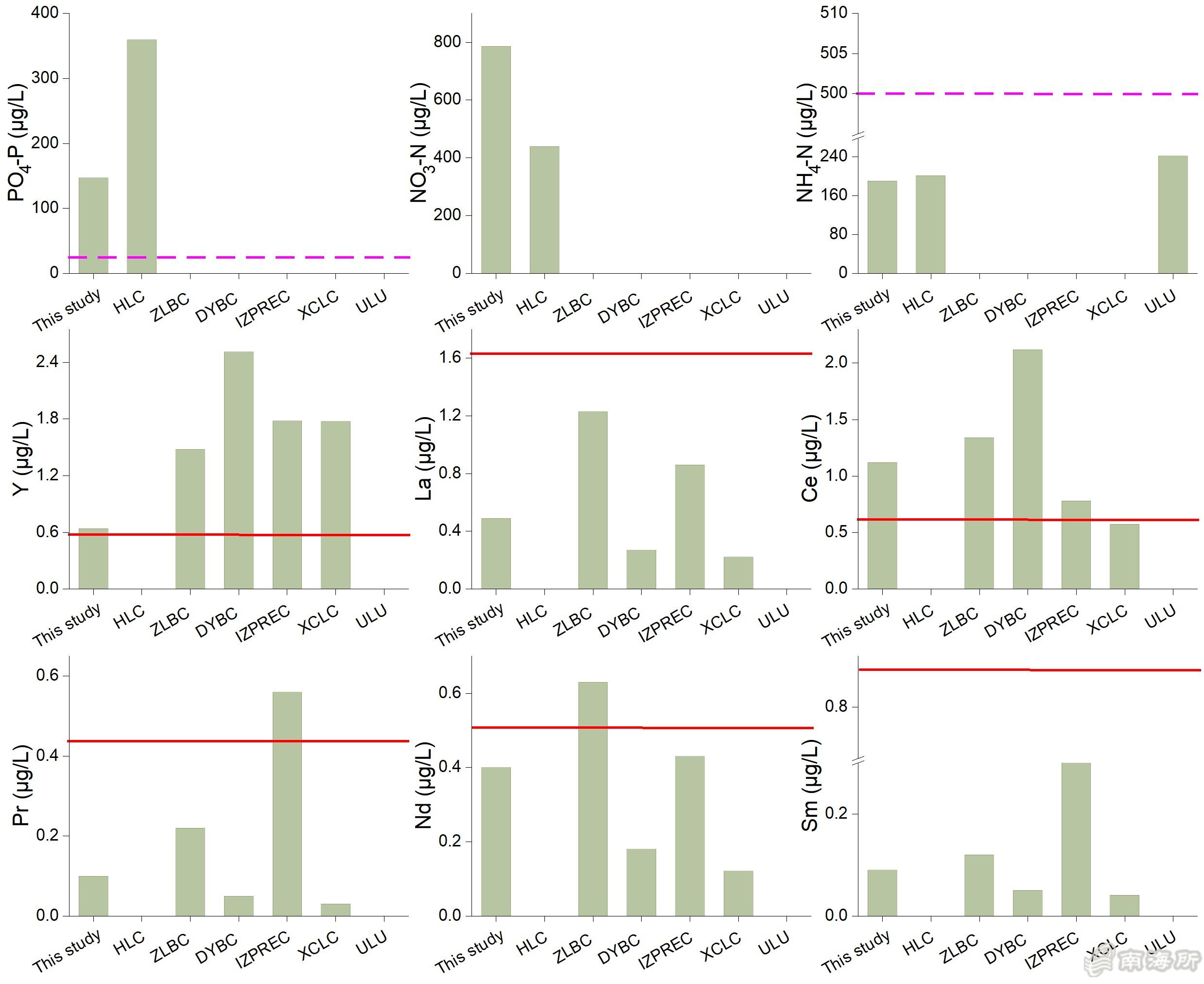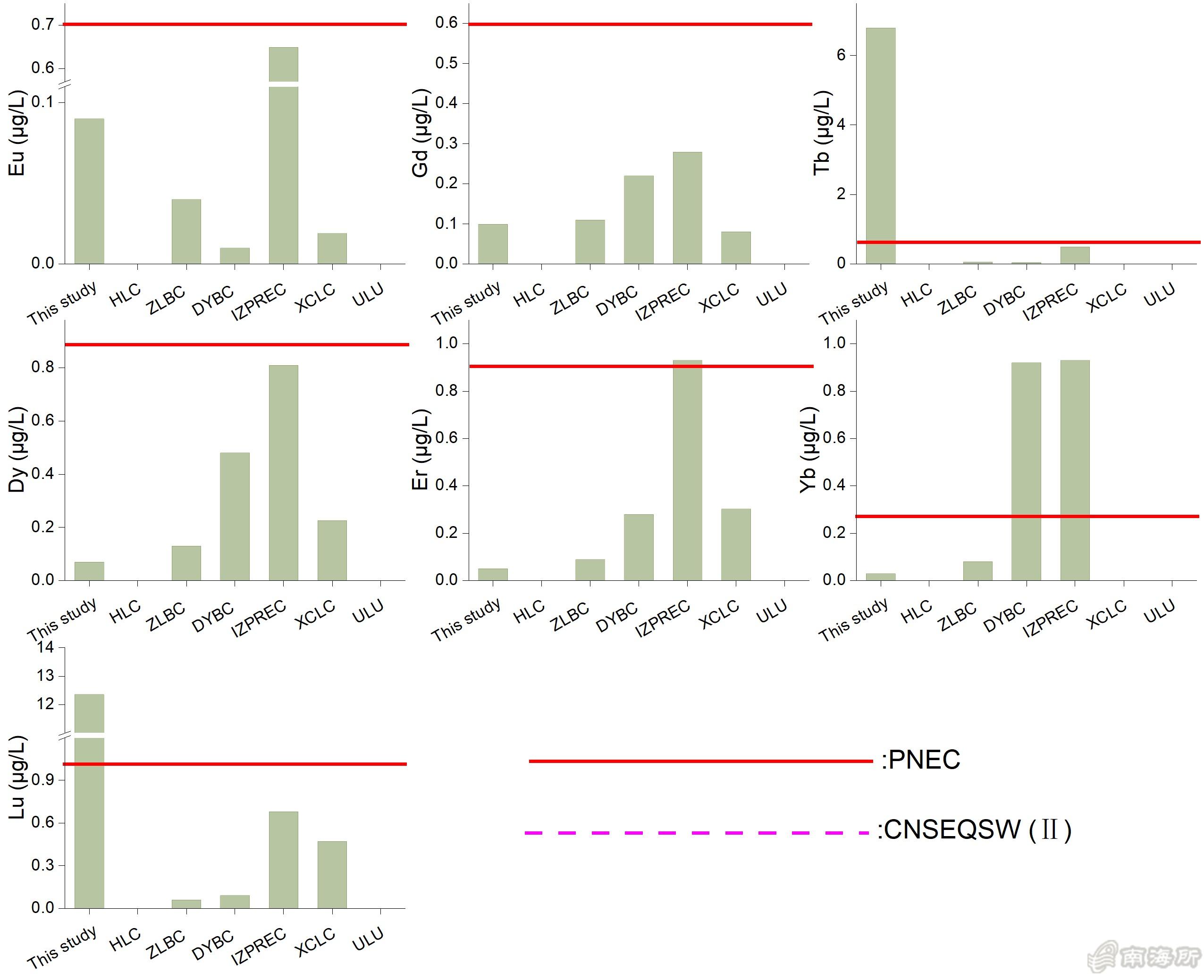 鍥?/span>2. 媧辰婀栬〃灞傛矇縐墿涓惀鍏葷洂鍜?/span>REEs鐨?/span>DGT嫻撳害鍙?qiáng)鍏朵笌鐩稿呄x爣鍑嗗拰鍦板尯鐨勬瘮杈冦?/span>PNEC錛氶嫻嬫棤褰卞搷嫻撳害銆?/span>CNSEQSW (鈪?/span>)錛氭垜鍥藉湴琛ㄦ按鐜璐ㄩ噺鍥藉鏍囧噯錛?/span>GB 383-2002錛夌殑浜岀駭鏍囧噯錛涗簩綰ф爣鍑嗭紙鈪★級涓昏閫傜敤浜庨泦涓紡鐢熸椿楗敤姘村湴琛ㄦ按婧愪竴綰т繚鎶ゅ尯銆佺弽紼姘寸敓鐢熺墿鏍栨伅鍦般侀奔铏句駭鍗靛満鍜岄奔鑻椼佸辜楸肩殑楗墊枡鍖虹瓑銆?/span>HLC錛氬懠浼︽箹銆?/span>ZLBC錛氭煒鏋楁咕銆?/span>DYBC錛氬ぇ浜氭咕銆?/span>IZPREC錛氱彔姹熷彛娼棿甯︺?/span>XCLC錛氭柊鏉戞咕銆?/span>ULU錛氱編鍥界殑鐘逛粬婀栥傛湰鐮旂┒涓墍鎻愬強(qiáng)鐨?/span>ULU嫻撳害鏄寚姘翠綋涓殑嫻撳害錛岃屼笉鏄嬌鐢?/span>DGT鎶鏈祴閲忕殑娌夌Н鐗╀腑鐨勬祿搴︺?/span>