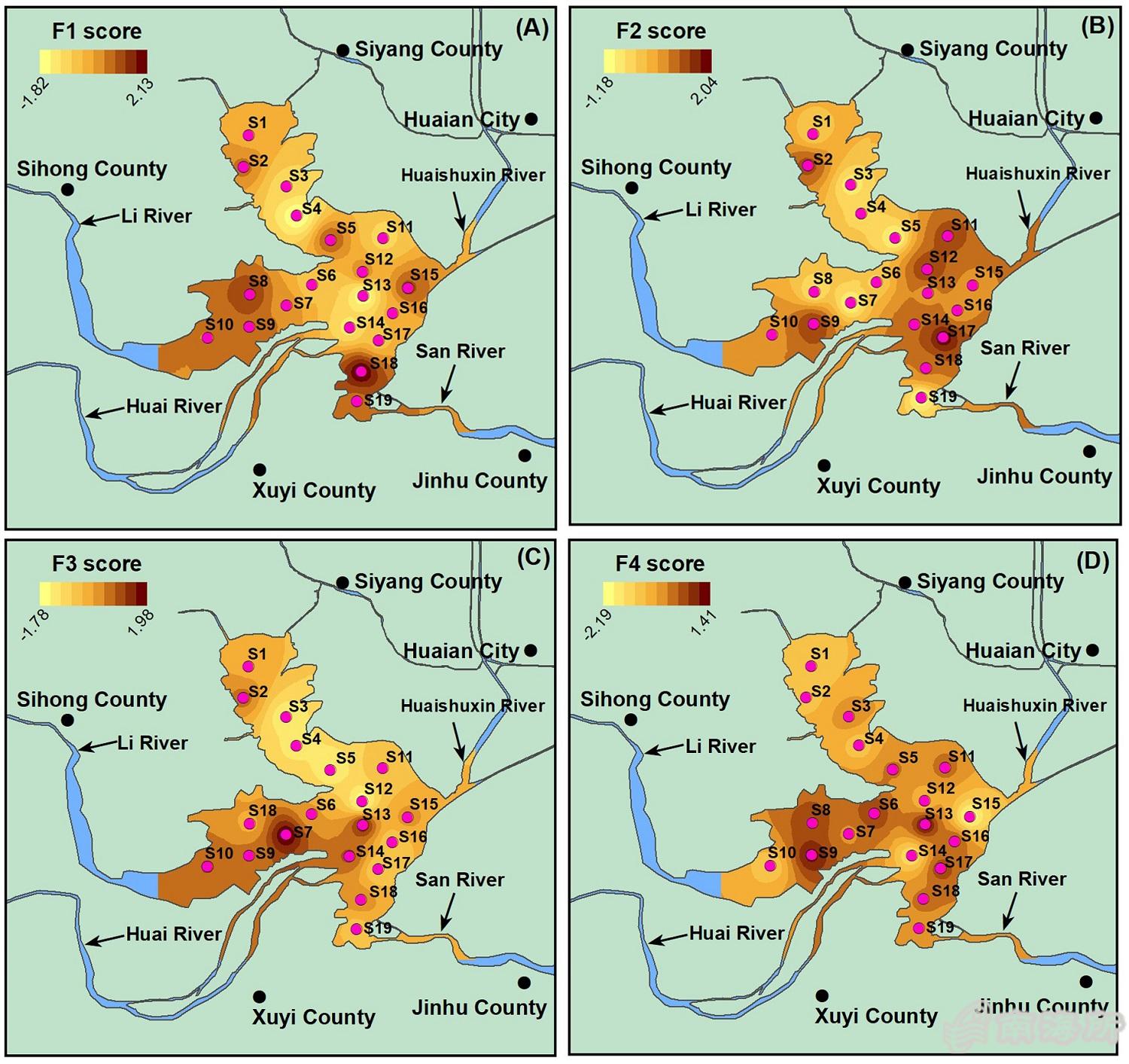 鍥?/span>5. 鍩轟簬鍦扮悊淇℃伅緋葷粺錛?/span>GIS錛変腑鐨勫弽璺濈鏉冮噸錛?/span>IDW錛夋妧鏈紝媧辰婀栬〃灞傛矇縐墿涓?/span>F1銆?/span>F2銆?/span>F3鍜?/span>F4寰楀垎鐨勭┖闂村垎甯冨浘銆?/span>