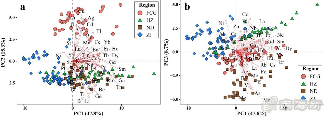 鍥?/span>3 瀹佸痙錛?/span>ND錛夈佹儬宸烇紙HZ錛夈佹箾姹燂紙ZJ錛夈侀槻鍩庢腐錛?/span>FCG錛夌墶铔庢牱鍝佷腑51縐嶅厓绱犵粍鎴愮殑PCA鍙屾爣鍥撅紝PC1涓?/span>PC2錛?/span>a錛夊拰PC1涓?/span>PC3錛?/span>b錛?/span>