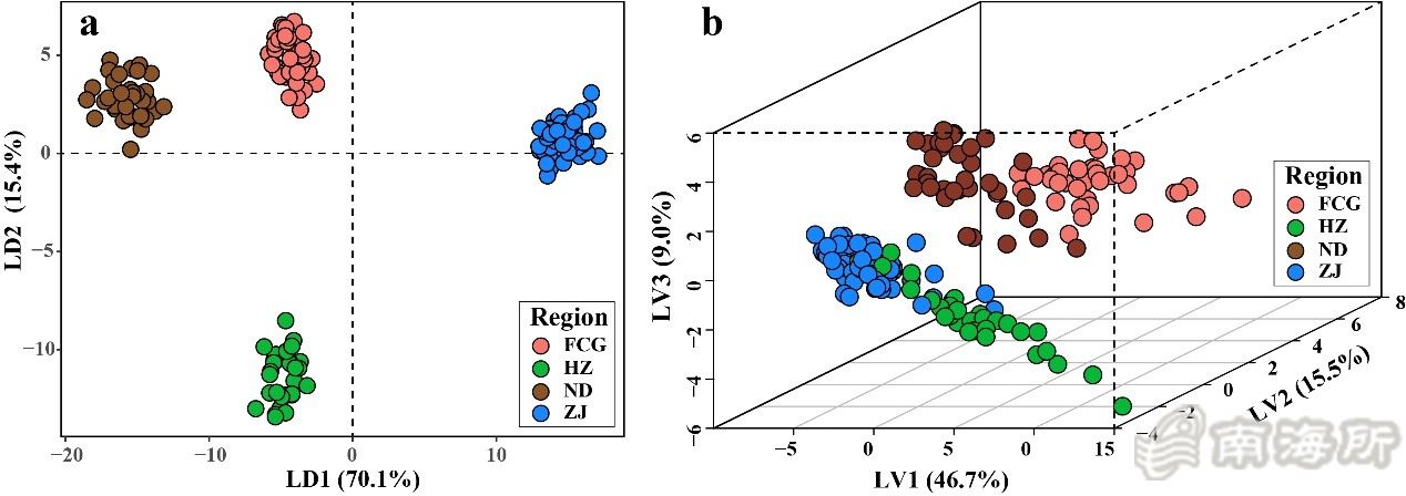 鍥?/span>4瀹佸痙錛?/span>ND錛夈佹儬宸烇紙HZ錛夈佹箾姹燂紙ZJ錛夈侀槻鍩庢腐錛?/span>FCG錛夌墶铔庢牱鍝佷腑51縐嶅厓绱犵粍鎴愮殑LDA鍥撅紙a錛夊拰PLS-DA 3D鍥撅紙b錛?/span>