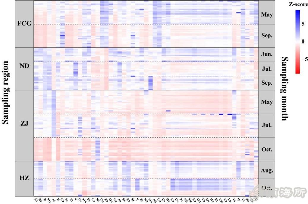 鍥?/span>2 瀹佸痙錛?/span>ND錛夈佹儬宸烇紙HZ錛夈佹箾姹燂紙ZJ錛夈侀槻鍩庢腐錛?/span>FCG錛夌墶铔庢牱鍝佷腑51縐嶅厓绱犵殑z鍒嗘暟鏍囧噯鍖栧惈閲忕儹鍥?/span>