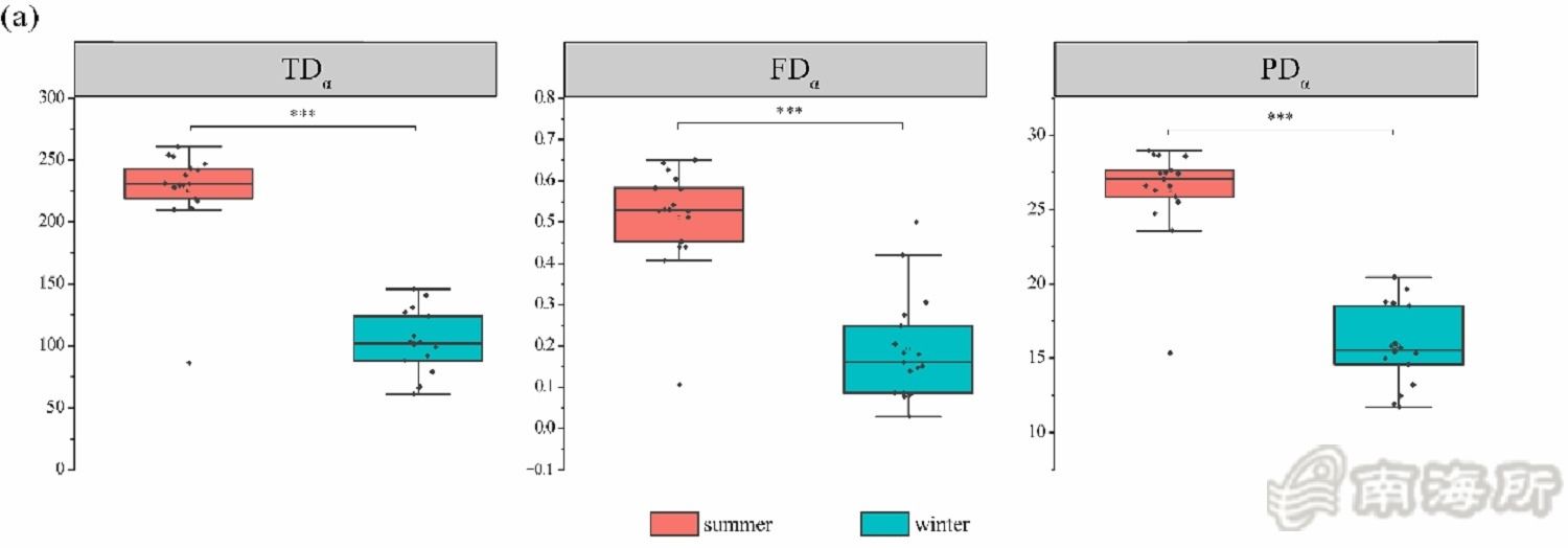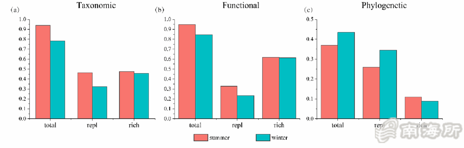 鍦ㄎ卞鏍鋒ф柟闈紝鍗楁搗鍖楅儴澶忓鐨勯奔綾誨垎綾誨鏍鋒э紙species錛?25 vs.102錛夈佸姛鑳藉鏍鋒э紙FRic錛?.51 vs.0.19錛変互鍙婄郴緇熷彂鑲插鏍鋒э紙PD錛?6.27 vs. 15.81錛夊潎楂樹簬鍐錛堝浘3錛夈傚湪尾澶氭牱鎬ф柟闈紝鐗╃鏇挎崲錛圧eplacement錛夊鎬諱綋尾澶氭牱鎬х殑璐$尞澶т簬涓板瘜搴﹀樊寮傦紙Richness difference錛夌殑璐$尞錛堝浘4錛夛紝璇存槑瀛h妭闂寸兢钀界粨鏋勭殑宸紓涓昏鐢辯墿縐嶆浛鎹㈤┍鍔ㄣ傜粨鏋滆〃鏄庡崡嫻峰寳閮ㄩ奔綾誨湪澶忓鏇翠負涓板瘜鍜屾椿璺冿紝鑰屽湪鍐琛ㄧ幇鍑烘洿鏄捐憲鐨勭┖闂村垎甯冨樊寮傦紝濡傝縼縐誨埌綰害杈冧綆銆佹俯搴﹁緝楂樼殑鍦板尯榪囧啲銆傛澶栵紝鍒╃敤姘寸幆澧冨拰鍦扮悊鐜鍥犵礌瑙i噴浜嗗崡嫻峰寳閮ㄩ奔綾晃卞拰尾澶氭牱鎬х殑鍙樺寲錛氬瀛i奔綾葷兢钀界粨鏋勬洿澶氬湴鍙楀埌姘寸幆澧冨洜绱犵殑褰卞搷錛岃屽啲瀛e垯鏇村鍦板彈鍒板湴鐞嗗洜绱犵殑褰卞搷錛堝浘5錛夈?/p>