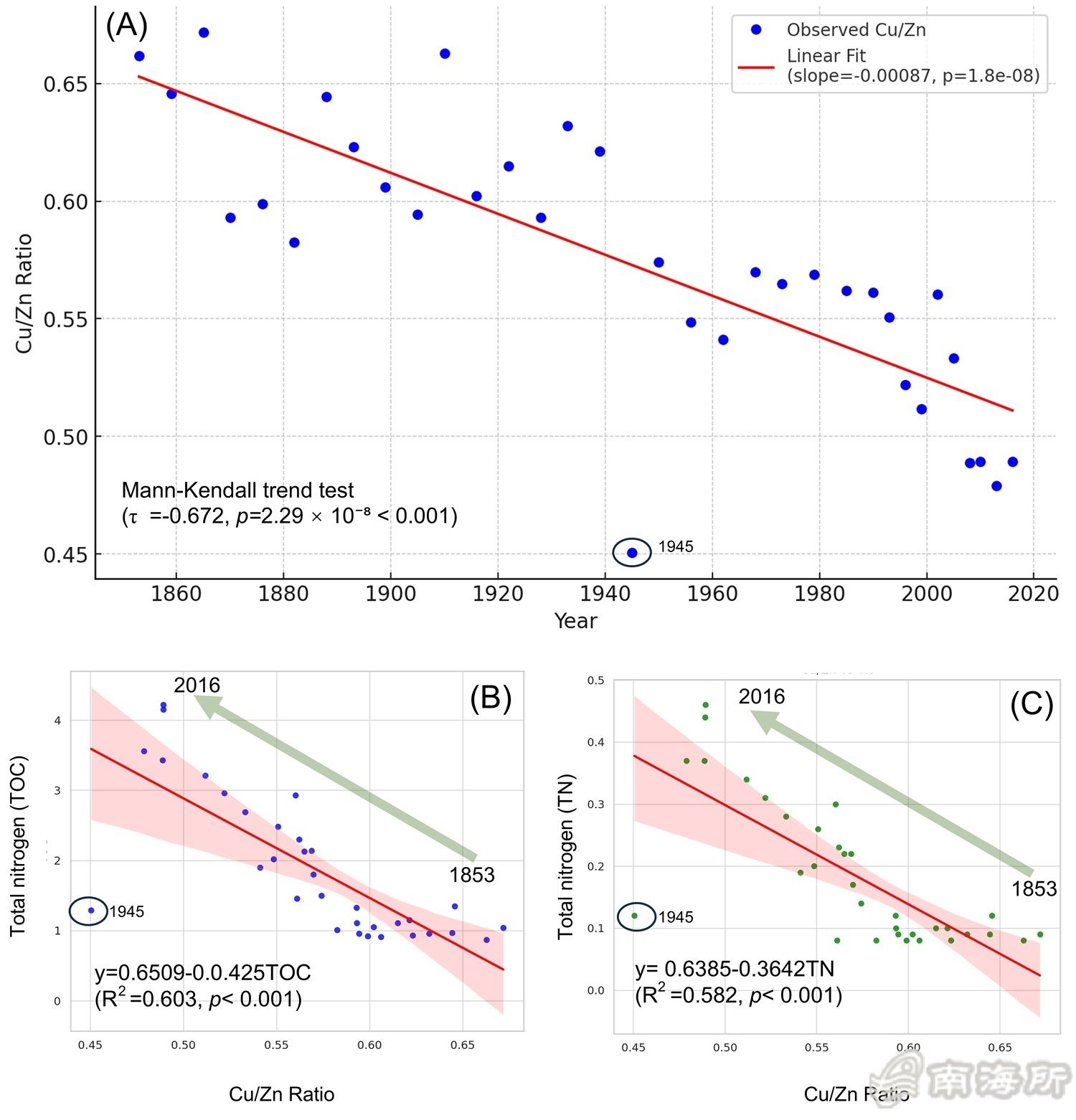 鍥?/span>2. 鏁g偣鍥炬樉紺烘樉钁楄礋鐩稿叧鍏崇郴錛?/span>(A) Cu/Zn涓庡勾浠戒箣闂寸殑璐熺浉鍏沖叧緋伙紱(B) Cu/Zn涓庢繪湁鏈虹⒊錛?/span>TOC錛変箣闂寸殑璐熺浉鍏沖叧緋伙紱(C) Cu/Zn涓庢繪愛錛?/span>TN錛変箣闂寸殑璐熺浉鍏沖叧緋匯傝繖浜涘叧緋婚氳繃綰挎у洖褰掑拰鏃墮棿搴忓垪鍒嗘瀽寰楀嚭錛岀獊鍑轟簡姘у寲榪樺師鍔ㄦ佸娌夌Н鐗╀腑TOC鍜?/span>TN淇濆瓨鐨勫獎鍝嶃?/span>