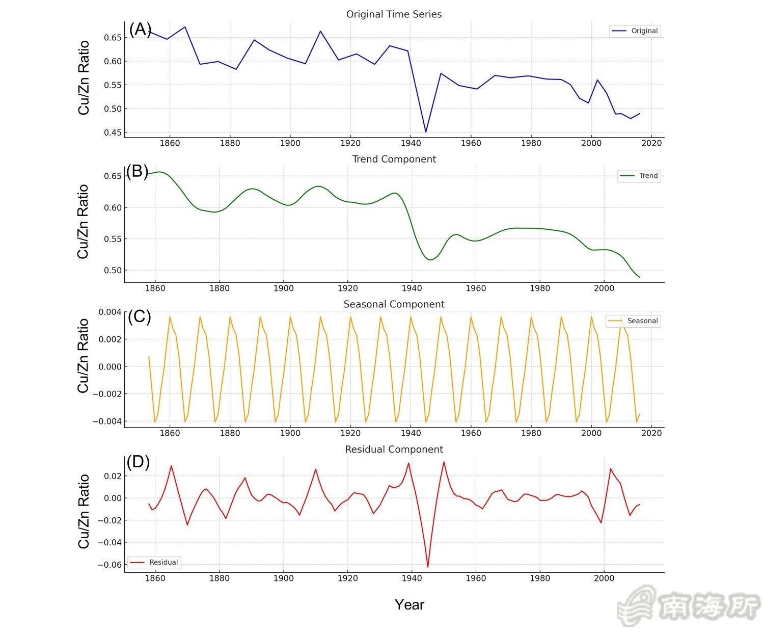 鍥?/span>1. 鏂版潙婀炬煴鐘舵矇縐墿鏍鋒湰涓?/span>Cu/Zn姣旂巼鍦ㄨ繃鍘?/span>167騫達紙1853锝?/span>2016騫達級鐨勯暱鏈熷彉鍖栬秼鍔?/span>(A) Cu/Zn姣旂巼鐨勫師濮嬫椂闂村簭鍒楁暟鎹紝鏄劇ず鍑轟竴涓愭笎涓嬮檷鐨勮秼鍔匡紝鍙嶆槧浜嗘柊鏉戞咕姘翠綋涓哀鍖栬繕鍘熺數浣嶇殑涓嬮檷錛?/span>(B) 閫氳繃鏃墮棿搴忓垪鍒嗘瀽寰楀嚭鐨勬柊鏉戞咕鏌辯姸娌夌Н鐗╂牱鏈腑Cu/Zn姣旂巼鐨勯暱鏈熻秼鍔匡紝鏄劇ず鍑?/span>Cu/Zn姣旂巼鐨勯愭笎涓嬮檷錛岃〃鏄庤姘翠綋姘у寲榪樺師鐢典綅鐨勬寔緇笅闄嶏紱(C) 閫氳繃鏃墮棿搴忓垪鍒嗚В鎻愬彇鐨勫鑺傛ф垚鍒嗭紝琛ㄦ槑瀛h妭鎬у彉鍖栨瀬灝忥紝涓庨暱鏈熸矇縐繃紼嬩竴鑷達紱(D) 鍦ㄥ幓闄ら暱鏈熻秼鍔垮拰瀛h妭鎬ф垚鍒嗗悗鐨勬畫宸紝鏄劇ず闅忔満娉㈠姩錛岃〃鏄庢暟鎹腑娌℃湁鍏朵粬緋葷粺鎬фā寮忋?/span>