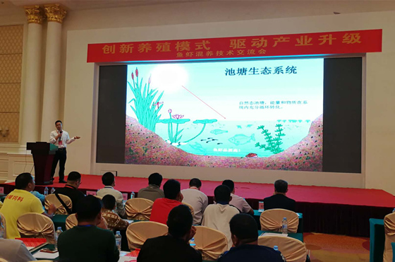 此次交流培訓會由廣東恒興飼料實業(yè)股份有限公司主辦,旨在積極推動魚蝦混養(yǎng)模式推廣和廣大客戶創(chuàng)造效益。重點實驗室朱長波博士針對當前魚蝦混養(yǎng)模式現(xiàn)狀,在大會上作了題為“對蝦生態(tài)養(yǎng)殖技術與模式”的專題報告,對池塘生態(tài)和物質循環(huán)理論、生態(tài)養(yǎng)殖的技術要點及多種新型的魚蝦混養(yǎng)模式進行了詳細講解,并和重點實驗室其他專家一起與養(yǎng)殖戶們進行互動交流,現(xiàn)場解答大家在養(yǎng)殖過程中遇到的技術難題。
