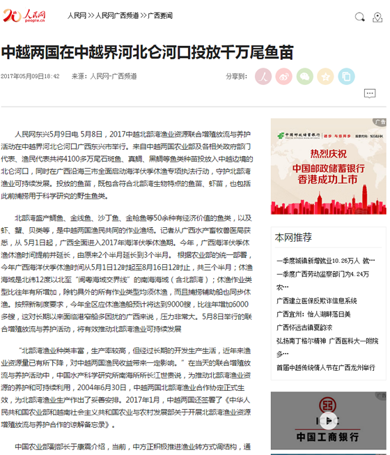 人民網:中越兩國在中越界河北侖河口投放千萬尾魚苗