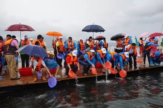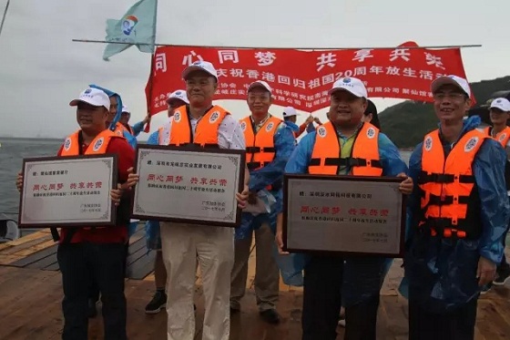 此次放生采用科學規范方式,將魚苗先寄養在與香港山水相連的深圳市放生海域的深水網箱里,開箱即可放生,魚苗已適應了自然環境,成活率高,更符合科學放生理念。深圳市龍岐莊實業發展有限公司為此次放生無償捐獻了100多萬尾卵形鯧鲹魚苗,深圳深水網箱科技有限公司、聚仙館客家餐廳、南海所深圳試驗基地、農業部南海漁業資源環境科學觀測實驗站等對此次活動組織和實施提供了條件保障和大力支持。魏平英為幾家支持單位現場頒發了紀念牌匾。