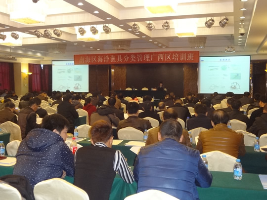 2015年12月15日至16日,農業部南海漁業資源開發利用重點實驗室聯合廣西壯族自治區漁政指揮中心,在廣西北海市舉辦了南海區海洋漁具分類管理培訓班。重點實驗室科研人員楊吝研究員任授課主講,并現場分發由其專門編制的《南海區海洋漁具分類管理宣傳圖冊》等培訓教材250多本;來自廣西區沿海有關市、縣(區)漁業主管部門、漁政執法人員和漁民代表等共200多人參加了培訓。