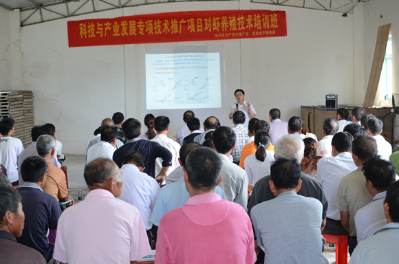 2016年4月27日至29日,重點實驗室派出翁雄研究員、李卓佳研究員、楊鶯鶯研究員等組成的專家組,到茂名市電白區嶺門鎮和龍山鎮,舉辦對蝦養殖技術培訓班,開展技術服務和指導。當地對蝦養殖從業者300多人參加了培訓。