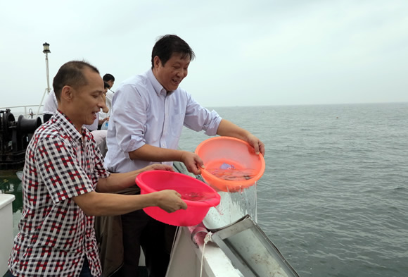 會議期間,與會領導和專家還現場考查人工魚礁建設工地和海上投放過程,并進行了人工魚礁區資源增殖放流。