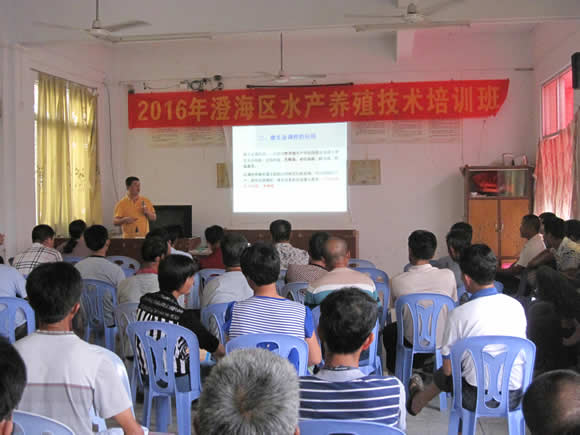 2016年5月13日至14日,重點實驗室科研人員李卓佳研究員、楊鏗助理研究員一行,應廣東省汕頭市澄海區海洋與漁業局邀請,在澄海區鹽鴻鎮和溪南鎮等地開展對蝦養殖技術培訓,共有來自當地的基層技術推廣人員和養殖戶180多人參加了培訓。 培訓班上,李卓佳、楊鏗分別作了題為“南美白對蝦池塘養殖技術”、“對蝦養殖環境調控劑與應用技術”的指導講座,并就當地對蝦養殖過程出現的實際問題與養殖戶們進行熱烈交流,答疑解難。此次活動向養殖戶贈送對蝦養殖技術資料300多份。