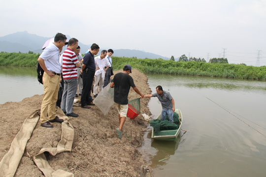 2015年8月20日,廣東省海洋與漁業技術推廣總站組織專家對實驗室承擔的斑節對蝦雜交新品系選育工作情況進行了現場測試驗收。 驗收專家組聽取了斑節對蝦選育情況匯報,查閱了試驗和養殖生產的原始記錄和相關資料,并在臺山市都順漁業養殖專業合作社的莘村亦豐圍對蝦養殖場,對斑節對蝦選育雜交新品系進行了包括表型性狀數據、生長速度及成活率等多指標現場測試。驗收專家組經質詢和討論,一致同意“斑節對蝦選育雜交新品系生長測試”通過現場驗收。