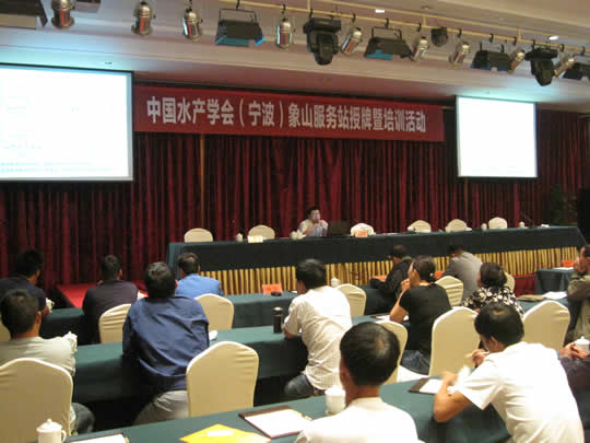活動期間,實驗室科研人員先后走訪了象山、寧海當地的水產苗種繁育企業和養殖企業,深入了解當地對蝦養殖技術現狀,并就養殖生產中存在的相關技術細節問題與技術人員進行充分的溝通和交流,現場派發技術資料50多份,取得了良好效果。曹煜成還作了題為“對蝦養殖池塘環境菌藻調控技術”的講座,吸引當地養殖技術人員120多人參加。
