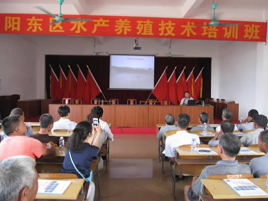 2015年10月29日,應廣東省陽江市陽東區科技局邀請,實驗室科研人員楊鏗赴陽江市陽東區大溝鎮開展對蝦養殖技術培訓,現場派發技術資料150多份,共有130多名對蝦養殖戶參加了培訓。 培訓班上,楊鏗針對近幾年南美白對蝦養殖成功率低、養殖過程中出現新的技術難題等情況,作了題為“對蝦養殖池塘環境調控技術”的講座,并就養殖生產中存在的相關技術問題與參訓人員進行了交流,答疑解惑,取得了良好社會效益。