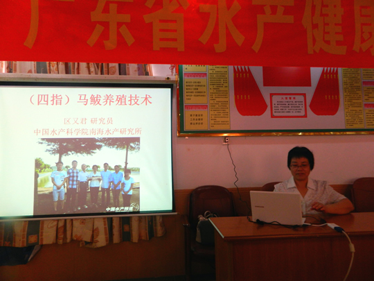 為大力推廣廣東省名貴海水魚類新品種四指馬鲅的健康養殖技術,2015年10月28日,廣東省海洋與漁業技術推廣總站在茂名市舉辦了馬鲅健康養殖技術培訓班,邀請實驗室科研人員區又君研究員和李加兒研究員為培訓班授課。來自全省各地150多名水產從業技術人員參加了培訓。