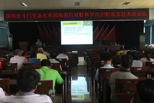 2015年5月31日,珠海市斗門生態農業園南美白對蝦和羅氏沼蝦混養技術培訓班在白焦鎮舉辦,園區有關領導和業務負責人、白焦鎮水產企業技術人員、對蝦養殖戶等150多人參加了培訓。實驗室朱長波博士應邀為培訓班授課。