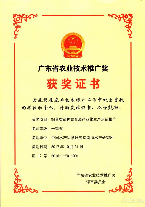 近日,廣東省農業技術推廣獎評審委員會對2017年評審的2016年度廣東省農業技術推廣獎獲獎項目頒發證書,其中一等獎11項、二等獎36項、三等獎44項。重點實驗室區又君研究員主持完成的“鯔魚類苗種繁育及產業化生產示范推廣”項目榮獲廣東省農業技術推廣獎一等獎并獲榮譽證書。
