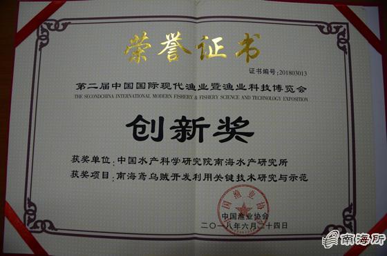 南海所在博覽會上集中展示的科技成果得到評審專家以及組委會的一致好評,其中“卵形鯧鰺種質資源發掘與優質大規格苗種規?;嘤夹g”、“南海主要海水養殖魚類免疫機制及其在免疫防治中的應用”、“南海鳶烏賊開發利用關鍵技術研究與示范”、“內陸工廠化循環水養殖石斑魚技術”、“新型瓊膠加工技術”、“卵形鯧鲹配合飼料研究與應用”獲得了此次博覽會“創新獎”,所辦企業的“活性酵素”、“活力健”成果產品獲得了博覽會“金獎”。