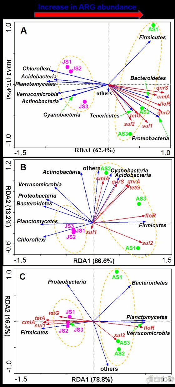 該創新團隊此前還跟蹤分析了珠三角地區半集約化對蝦養殖環境中ARGs的分布特征,發現養殖水源水是ARGs的重要來源。相關研究成果以論文“Occurrence and temporal resistance genes (ARGs) in shrimp aquaculture: ARGs dissemination from farming source to reared organisms”發表在《Science of the Total Environment》上(IF=4.900, 2017)。