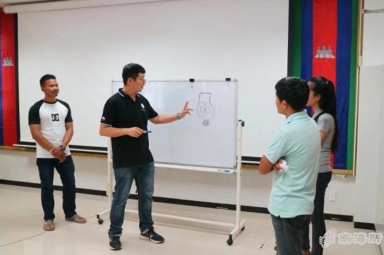作為柬埔寨海水魚養(yǎng)殖的主要品種,尖吻鱸目前人工育苗遇到瓶頸,苗種緊缺,養(yǎng)殖過程中病害頻發(fā),嚴(yán)重影響了其養(yǎng)殖業(yè)發(fā)展。針對柬埔寨尖吻鱸養(yǎng)殖產(chǎn)業(yè)存在的主要問題,馬振華作了4個專題講座,分別是Feeding of warm water marine fish larvae in early life;Aquaculture and Biology of Asian seabass, Broodstocks management for Asian seabass;Larval fish rearing and nursery; Grow-out, nutrition and disease。他還指導(dǎo)和帶領(lǐng)大家開展了包括繁育、育苗、標(biāo)粗、營養(yǎng)、養(yǎng)殖技術(shù)及病害防控等方面的實(shí)驗操作和實(shí)踐,并通過交流互動,現(xiàn)場解答大家關(guān)于尖吻鱸養(yǎng)殖方面的一系列問題,進(jìn)一步提高了學(xué)員們的健康養(yǎng)殖意識和技能。