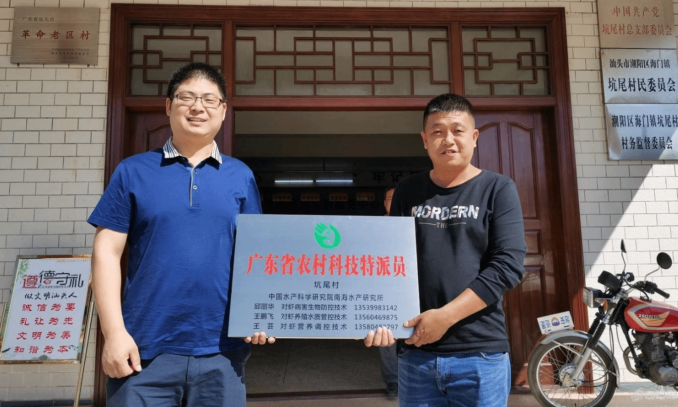 在汕頭市海門鎮坑尾村,王鵬飛副研究員等一行4人與村委干部和養殖戶們進行座談交流,全面了解當地水產養殖過程中遇到的技術難點,深入養蝦池塘開展現場指導,贈送一批調水產品和對蝦養殖技術資料,強調提醒有關注意事項,積極為該村水產養殖產業實現健康生態發展提供指導和支持。