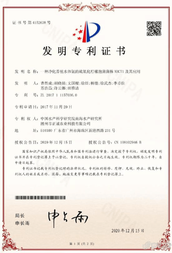 近日,由農(nóng)業(yè)農(nóng)村部南海漁業(yè)資源開發(fā)利用重點(diǎn)實(shí)驗(yàn)室曹煜成、胡曉娟、文國樑等發(fā)明的“一種凈化養(yǎng)殖水體氨的硫氧化檸檬胞菌菌株XHCT1及其應(yīng)用”獲國家發(fā)明專利授權(quán),專利號為:ZL201711157036.0。該菌株現(xiàn)保藏于中國典型培養(yǎng)物保藏中心,保藏編號CCTCC:M2017436。