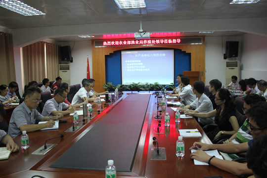 2014年5月29日,應(yīng)農(nóng)業(yè)部南海漁業(yè)資源開發(fā)利用重點(diǎn)實(shí)驗(yàn)室的邀請(qǐng),農(nóng)業(yè)部漁業(yè)漁政管理局養(yǎng)殖處丁曉明處長(zhǎng)到重點(diǎn)實(shí)驗(yàn)室依托單位—南海水產(chǎn)研究所進(jìn)行交流指導(dǎo)。南海所所長(zhǎng)江世貴主持交流會(huì),黨委書記劉新中、副所長(zhǎng)李純厚和科研處、養(yǎng)殖室、漁病室、漁工室等相關(guān)處室負(fù)責(zé)人及專家、聯(lián)合培養(yǎng)研究生等50多人參加了交流。