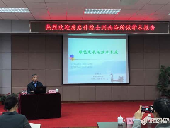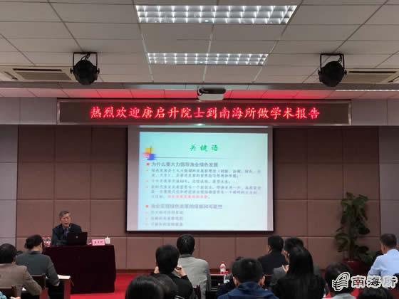 12月20日,重點實驗室特邀中國工程院院士、中國水產科學研究院黃海水產研究所唐啟升研究員作了題為“綠色發展與漁業未來”的學術報告。南海所所長江世貴主持報告會,所黨委書記徐竹青,副所長楊北勝,黨委副書記陳水勝,南海所副所長、重點實驗室主任李純厚以及科研人員、聯合培養研究生等100多人參加了學術報告。
