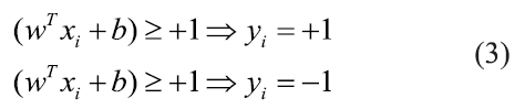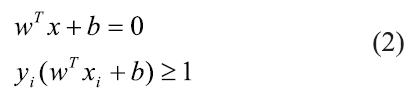 支持向量機最初用于對線性可分問題進行分類,給定訓練樣本﹛(x1,y1),(x2,y2),(x3,y3),Λ(xn,yn)﹜得到期望輸出y∈﹛-1,1﹜。即尋找一個超平面將訓練樣本分離,并使任意樣本的點到超平面的距離大于等于1。用于分類的最優超平面的方程為: