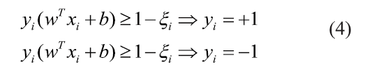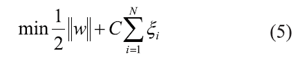 所有在上間隔邊界上方的樣本屬于正類,在下間隔邊界下方的樣本屬于負類,位于間隔邊界上的正類和負類樣本為支持向量(SupportVector)。對于非線性問題,需適當放松約束條件,引入松弛變量ζi>0,此時的分類條件變為: