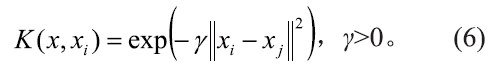 對于非線性分類問題,可使用映射函數將其轉化為線性可分問題,此時作為決策邊界的超平面表示為wtφ(x)+b=0。公式中φ(x)即為映射函數,可定義映射函數的內積為核函數k(x1,x2)=φ(x1)Tφ(x2)。常見的核函數有多項式核、徑向基(RBF)函數核、拉普拉斯核等。本次實驗使用RBF核函數:
