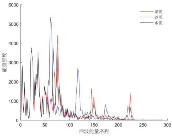 圖1-a為淤泥底質在不同工作頻率下的淺剖能量序列分布情況,高頻(200kHz)下其分布中只出現兩個較為明顯的波峰,第一個波峰為水面反射,第二個波峰為聲波到達海底表面后的反射。低頻(20kHz)下則出現了多個波峰,其平均能量也更高、低頻穿透性較強,其分布更能反映出不同底質的特征。圖1-b為淤泥、砂礫、水泥3種不同底質的回波能量序列分布,可以觀測到不同底質的回波能量序列分布具有差別。