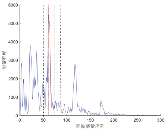 回波能量序列分布與深度有關,進行數據選取時,需剔除深度的影響,利用閾值算法來獲取回波能量序列中代表底質特征的部分。如圖3所示設每幀回波能量序列為﹛P1(h1,k1),P2(h2,k2)ΛPn(hn,kn)﹜,其中hi為序列值,ki為能量強度。根據測量時的水深值可根據公式⑴計算出水深的序列D,根據水深序列D設定合適的范圍﹛D∈[hmin,hmax]﹜,如圖3黑色虛線,在設定的閾值內,尋找能量強度的最大值得到水底表面的深度序列h,選取適當的厚度△h,截取海底表面深度h后的[h,h+△h]范圍內的回波能量序列作為底質分類的有效原始數據,即圖3紅色虛線,對數據進行篩選,這樣可以有效地過濾掉水面反射回波、二次回波等其它異常的回波能量。對底質厚度的選取,可在一定的厚度內進行循環測試,根據分類成功的準確率選取合適的底質厚度。