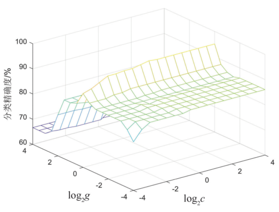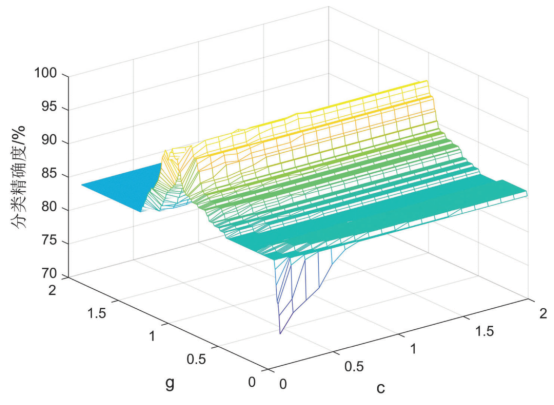式中:ki表示序列i的能量強度;max﹛ki﹜表示所有樣本數據中回波能量強度最大值;min﹛ki﹜表示所有樣本數據中回波能量強度最小值。訓練完成后利用測試集對分類準確率進行測試,如圖2所示。以測試集的分類準確率作為評價標準,不斷對參數進行優化測試,最終得到一定條件下最佳的懲罰參數c與核函數參數g。