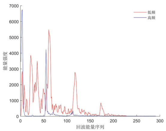 淺剖在工作中發射的脈沖強度是固定的,接收的回波強度由于深度和海底不同沉積物的反射系數、硬度、粗糙度等物理性質不同,其回波的能量序列特征也有所不同。具體表現為:⑴回波能量序列的總強度不同。不同底質之間回波能量序列的總強度存在較大差異,且與深度有關,深度較淺回波能量序列的總強度較強,較深回波能力較弱。⑵回波能量序列分布特征不同。淺剖發射的脈沖信號接觸到海底沉積物受到反射的同時,也會有一部分能量被吸收,利用反射的部分可以進行測深,而不同的沉積物對聲波的吸收不同,其能量分布存在較大的差異。⑶回波能量序列分布與換能器的工作頻率有關。工作頻率越低,其回波能量的平均強度越高,且出現波峰的序列越多,工作頻率越高,其回波總能量越低,波峰數量越少。