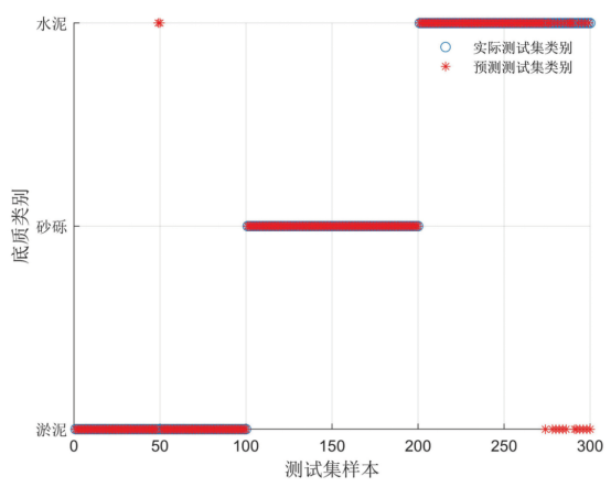 利用優化參數后的支持向量機,對測試集3類底質共300個樣本數據進行自動分類,分類結果如圖6所示,預測底質類型與測試集已知的底質類型相同,分類準確率為96%。其中淤泥有2個樣本被錯分為水泥,水泥有10個樣本被錯分為淤泥。