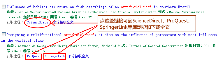 部分搜索結果見下圖。按獲取途徑來源,多數直接點擊可查看全文。目前通過讀秀平臺可瀏覽全文的資源主要有:Wiley InterScience 、ScienceDirect、SpringerLink、Annual Reviews、ProQuest以及開放存取電子期刊SOCOLAR 、HighWire Press 、Open J-Gate 等。