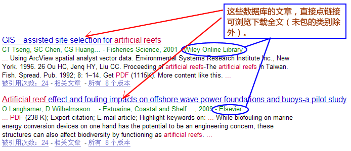 Google學術搜索的功能十分強大,其在搜索國外的學術資源上有明顯的優勢。仍以搜索“artificial reef PDF”為例,搜索結果及說明見下圖。