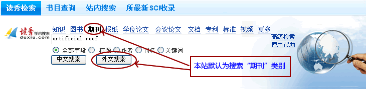 讀秀平臺搜索外刊的來源非常廣泛,下面以在外文期刊中搜索"artificial reef"(人工魚礁)來舉例說明: